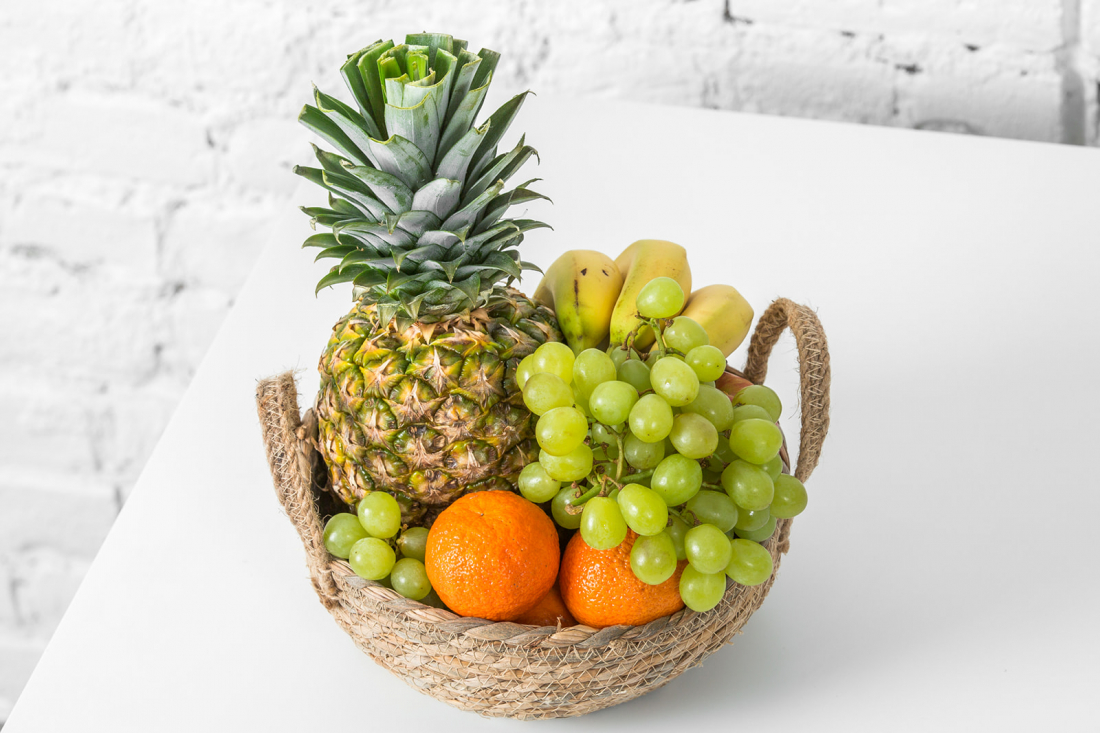 Augļu grozā ir 5 veidi augļi, kurus sakomplektē florists pēc iespējām un sezonalitātes.