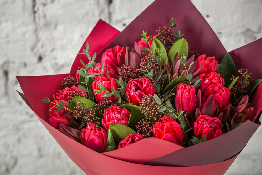 Pildīto tulpju pušķis sarkanos toņos, iepakots dekoratīvajā papīrā
