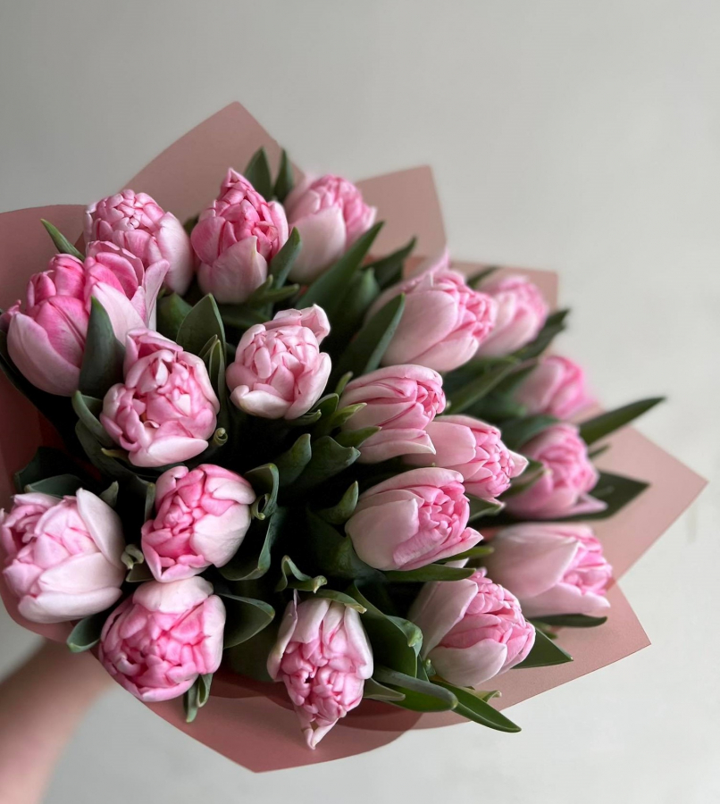 Pušķis no pildītajām tulpēm maigos toņos, iepakots dekoratīvajā papīrā