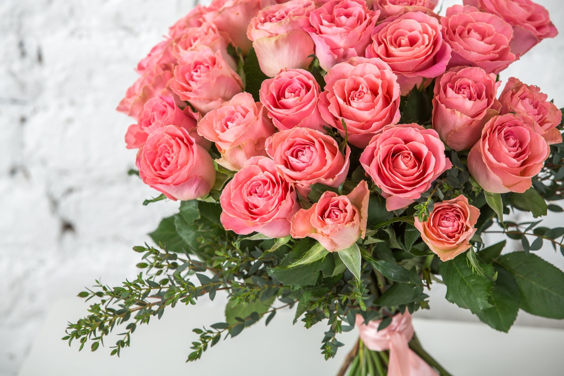 Rozā rožu pušķis, iepakots dekoratīvajā papīrā