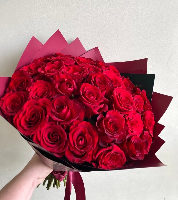 Klasisks rožu pušķis, iepakots dekoratīvajā papīrā