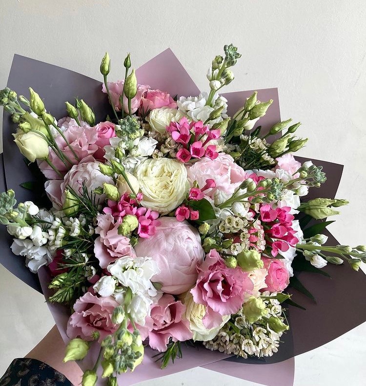 Sastāvs: Rozes, Peonijas, Lefkojas, Vaska puķe, Lizantes, Zaļumi