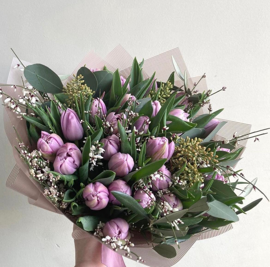 Pušķis no pildītajām tulpēm violetos toņos, iepakots dekoratīvajā papīrā