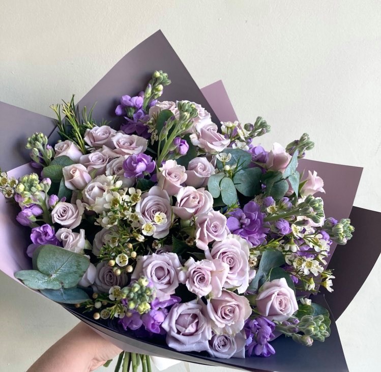 Dažādu ziedu pušķis violetos toņos, iepakots dekoratīvajā papīrā