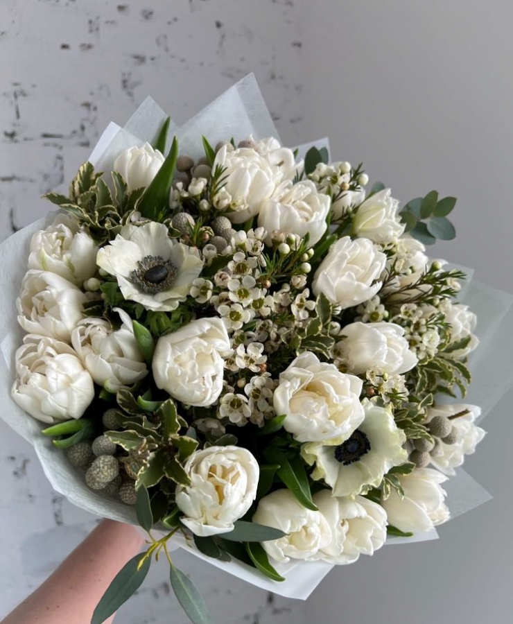 Ziedu pušķis pavasarīgiem ziediem "WHITE PERFECTION"