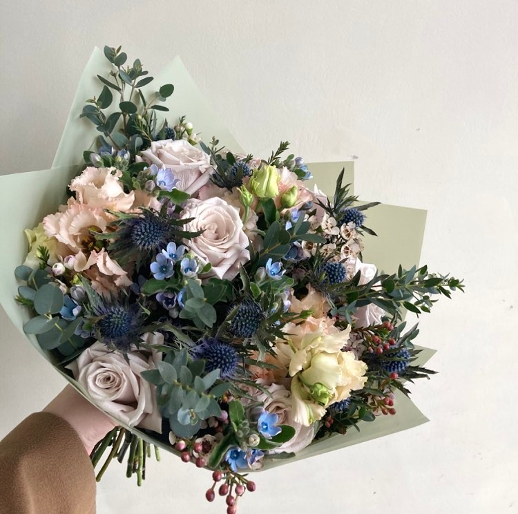 Sastāvs: Rozes, eryng dadzīši, vaska puķe, lizantes, oxipetalium, eikalipts